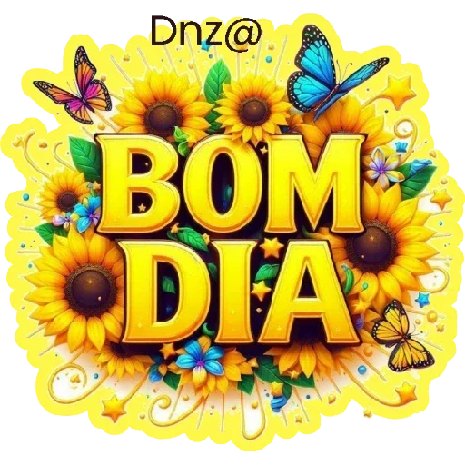 Um desenho colorido com girassóis, borboletas e a frase 'BOM DIA' em letras grandes e amarelas. O fundo é amarelo com detalhes brancos.
