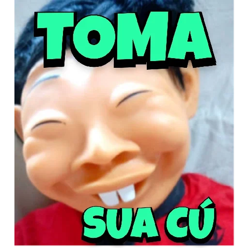 Rosto de um menino com olhos fechados e sorriso largo, usando uma camisa vermelha. Sobreposto, está escrito 'TOMA SUA CÚ' em letras grandes e verdes.