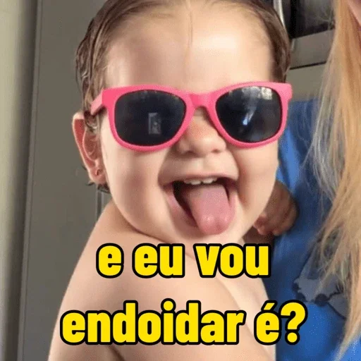 Um bebê com óculos de sol rosa fazendo careta e a frase 'e eu vou endoidar é?' em amarelo.