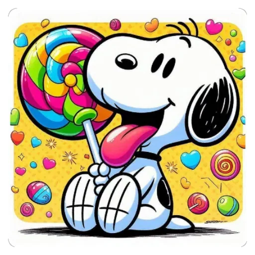 Um desenho do Snoopy, o cachorro do Peanuts, com uma língua grande e rosa para fora da boca, segurando um grande pirarucu de cores. Ele está cercado por doces coloridos em um fundo amarelo.