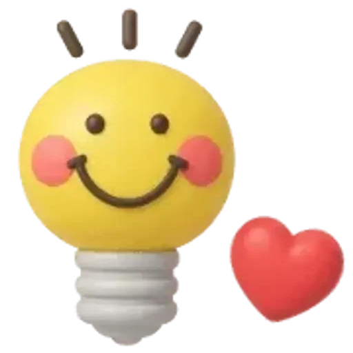 Lâmpada amarela com sorriso e bochechas rosadas, ao lado de um coração vermelho.