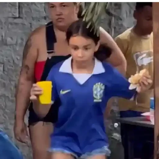 Menina vestindo uma camisa do Brasil, segurando um copo amarelo e um sanduíche, com uma mulher e um menino ao fundo.