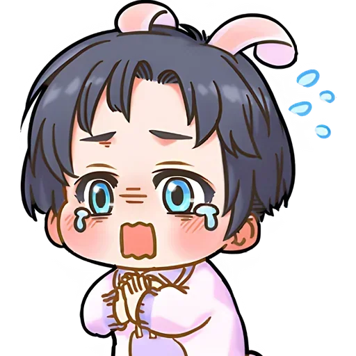 Menina de olhos azuis com expressão de tristeza e frustração, usando um pijama lilás e com orelhas de coelho rosa na cabeça.