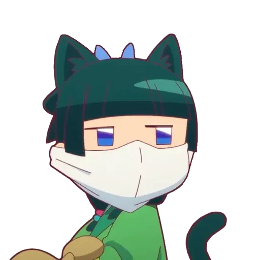 Personagem de anime com máscara facial e chapéu de gato, com olhos azuis e cabelo preto.