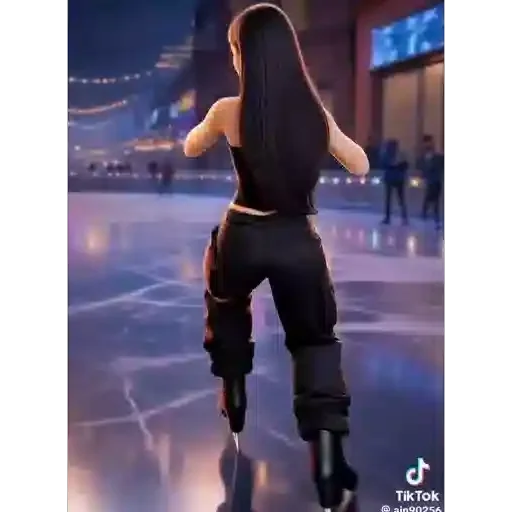 Uma mulher de longos cabelos pretos dançando em um ambiente noturno com luzes coloridas, usando roupas pretas e patins. Há um logotipo do Tik Tok no canto inferior direito.
