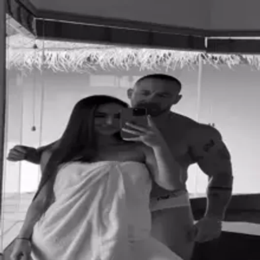 Um casal posa para uma selfie em preto e branco em frente a um espelho, com a mulher vestindo uma toalha e o homem nu, com um braço ao redor dela.