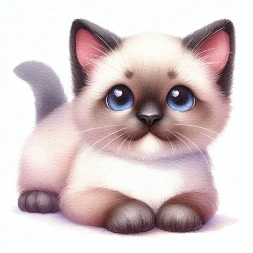Gatinho fofo com olhos azuis brilhantes e pelagem branca com marcas escuras no rosto e orelhas.