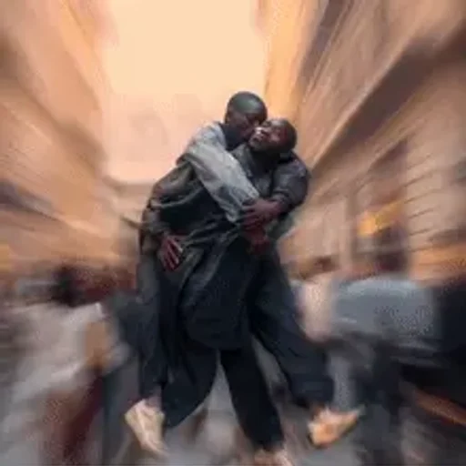 Dois homens se abraçando em um corredor, com pessoas ao fundo. A imagem é borrada e com tons de laranja.