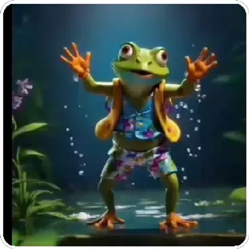 Um sapo verde com shorts florais e colete laranja dança em um ambiente aquático noturno, com plantas e flores ao lado.