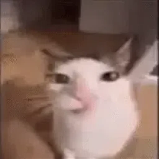 Gato com olhos grandes e arregalados, focinho rosa e pelagem branca e laranja, em um piso de madeira.