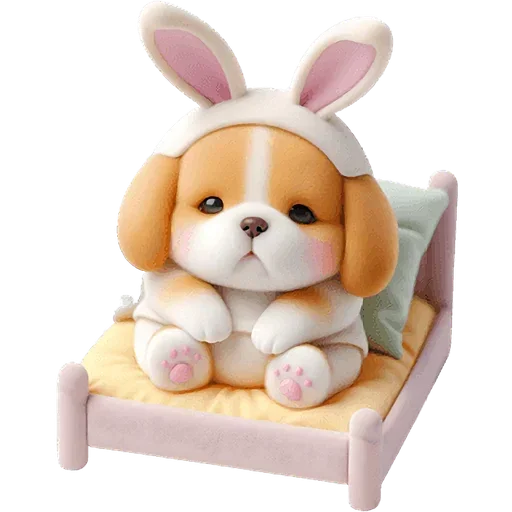 Um cachorrinho fofinho com orelhas de coelho sentado em uma cama cor-de-rosa. Ele tem uma expressão doce e fofa.