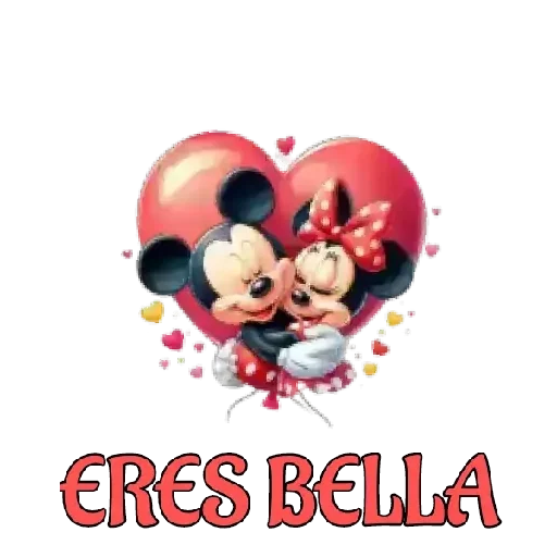 Mickey e Minnie Mouse abraçados em um coração vermelho com balões, rodeados de corações coloridos. Abaixo, o texto 'ERES BELLA' em letras vermelhas.