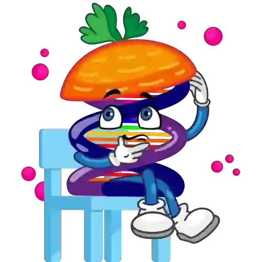 Um donut roxo e azul sentado em uma cadeira azul, com uma cenoura laranja na cabeça e uma expressão facial relaxada.