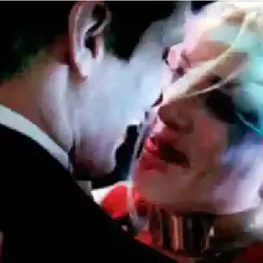 Um homem e uma mulher se beijando, com fumaça ao redor deles. O homem está de perfil, usando um terno preto com colarinho branco.