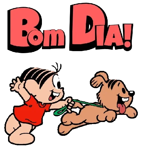Menino de fralda vermelha puxando a corda de um cachorro castanho, com o texto 'Bom Dia!' em letras grandes vermelhas.