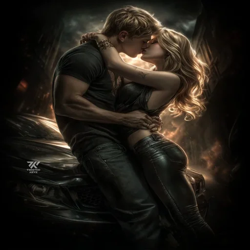 Um casal se beijando em um ambiente escuro com chamas ao fundo. O homem tem cabelos castanhos e veste uma camiseta preta, enquanto a mulher tem cabelos loiros longos e um vestido escuro.