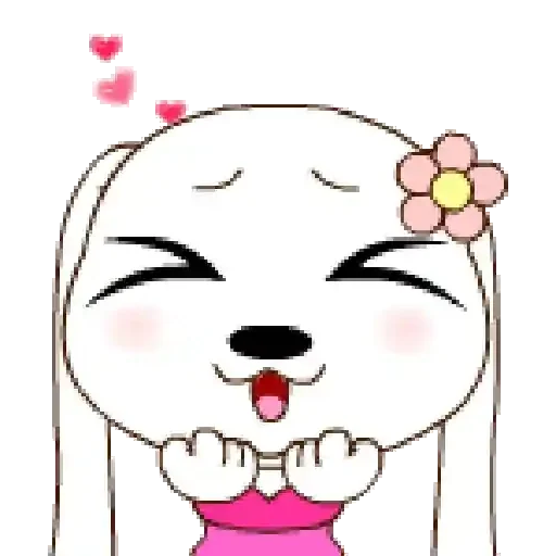Um desenho de um coelho branco com uma flor rosa no cabelo e um gesto fofinho, com coraçõezinhos rosa saindo da cabeça.