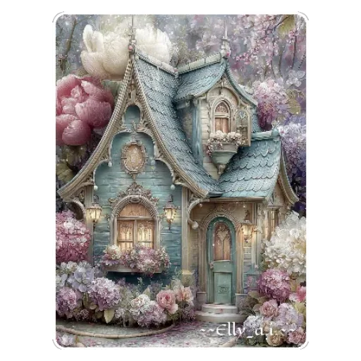 Uma casa de estilo gótico com telhado verde e porta verde, rodeada de flores cor-de-rosa e roxas. A casa tem janelas com luzes acesas e uma varanda com plantas.