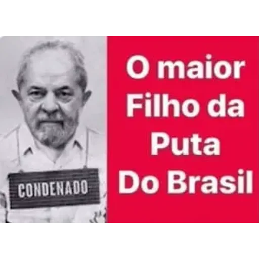 Um homem mais velho com um olhar sério, usando uma camisa branca e um cartão com a palavra 'CONDENADO' na frente. Ao lado direito, um fundo vermelho com o texto 'O maior Filho da Puta Do Brasil'.