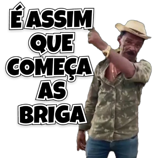 Homem com camisa camuflagem e chapéu de palha apontando o dedo para cima, com texto "É ASSIM QUE COMEÇA AS BRIGA" em letras grandes pretas.