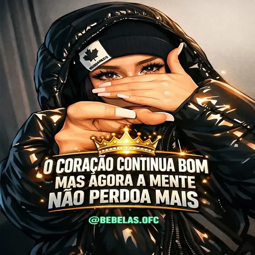 Uma pessoa com um capuz preto e um acessório na testa cobre o rosto com as mãos. A imagem traz o texto 'O CORAÇÃO CONTINUA BOM MAS AGORA A MENTE NÃO PERDOA MAIS' e '@BEBELAS.SPC' em verde.