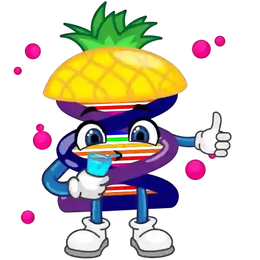 Um personagem de desenho animado com corpo de berinjela, usando um chapéu de abacaxi, óculos, luvas e sapatos, com um polegar para cima e um sorriso colorido.
