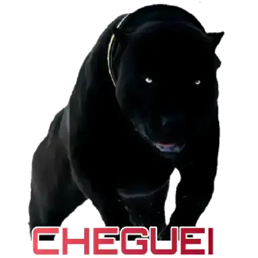 Um pantera preta musculosa com olhos brancos, posicionada de forma agressiva, com a palavra 'CHEGUEI' em letras vermelhas abaixo.