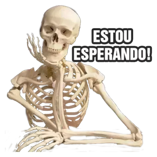 Esqueleto sentado com um braço levantado e texto "ESTOU ESPERANDO!"