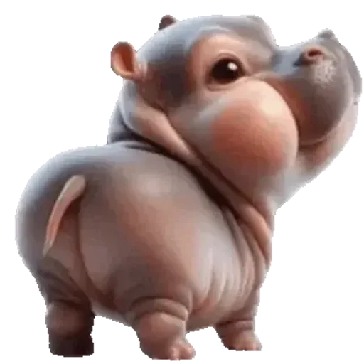 Um hipopótamo cinza claro com olhos castanhos e focinho rosa, virado para a direita com uma expressão curiosa.