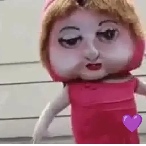 Boneca de pelúcia com cabelo ruivo e vestido rosa, parecendo triste ou surpresa, com um coração roxo no canto inferior direito.
