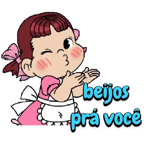 Menina de cabelo vermelho com coque e laços cor-de-rosa, bochechas rosadas, vestindo um avental branco e vestido rosa, fazendo um gesto de beijinhos. O texto 'beijos pra você' aparece ao lado.