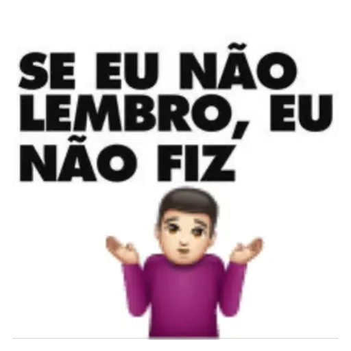Um homem com expressão confusa e mãos levantadas ao lado de um texto que diz 'SE EU NÃO LEMBRO, EU NÃO FIZ'. Ele veste uma camisa roxa.