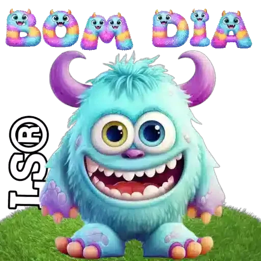 Um monstro azul fofinho com chifres roxos e olhos grandes, sorrindo, em um gramado verde. A palavra 'BOM DIA' está escrita acima dele em letras coloridas.