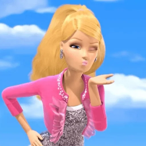 Boneca Barbie com cabelo loiro e um casaco rosa, fazendo um gesto com a mão em frente a um céu azul com nuvens brancas.