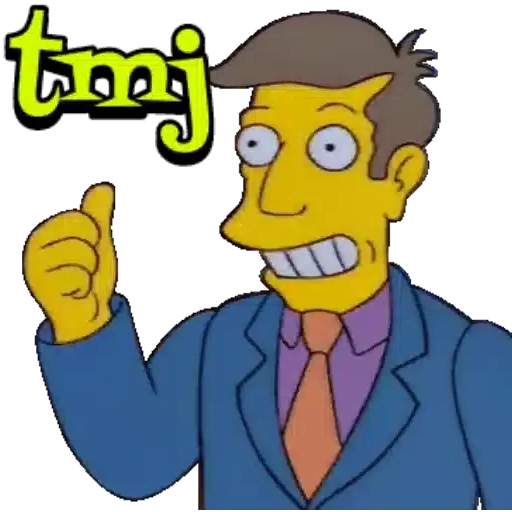 Personagem de desenho animado com expressão surpresa, usando terno azul e gravata laranja, com 'tmj' em letras verdes.