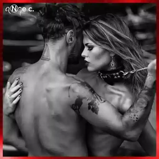 Um casal se abraçando, com a mulher tendo uma coleira de spikes e tatuagens nos braços, e o homem com as costas nuas e tatuagens. O fundo é escuro e desfocado.