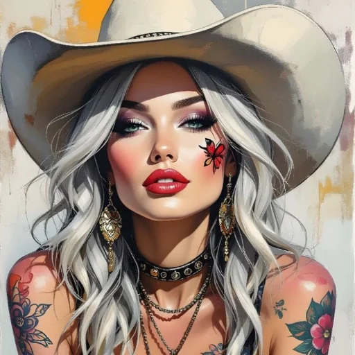 Uma mulher com cabelos grisalhos e chapéu de cowboy, maquiagem colorida e piercings, com tatuagens nos braços.