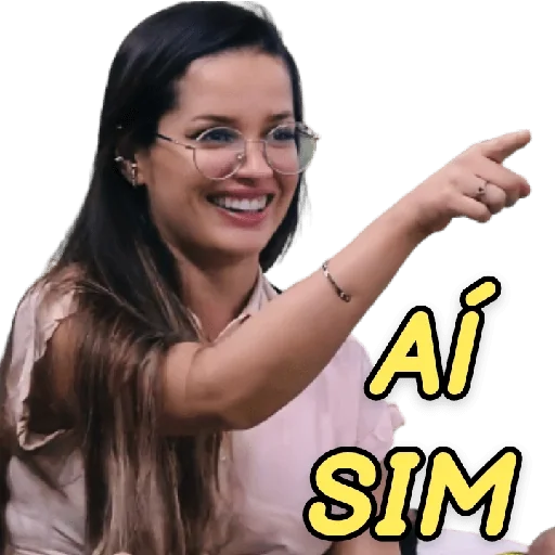 Uma mulher de cabelos pretos e óculos sorri e aponta para o lado, com as palavras 'Aí SIM' em amarelo ao lado.