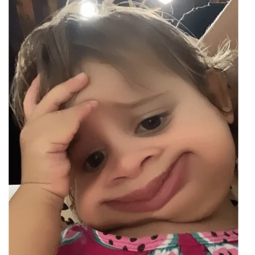Menina com a mão na testa e um sorriso leve, usando uma blusa rosa com estampas.