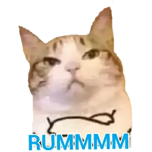 Gato com expressão relaxada e texto 'RUMMMM' em azul na parte inferior.
