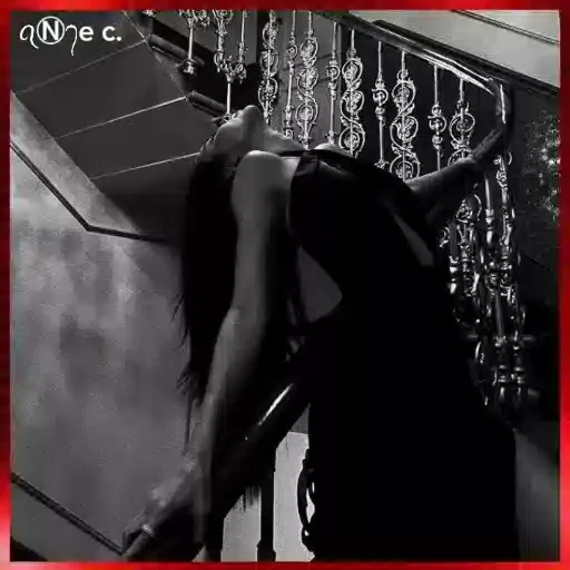 Uma mulher de vestido preto subindo uma escada com grades de metal decorativas. A imagem é em preto e branco com uma borda vermelha.