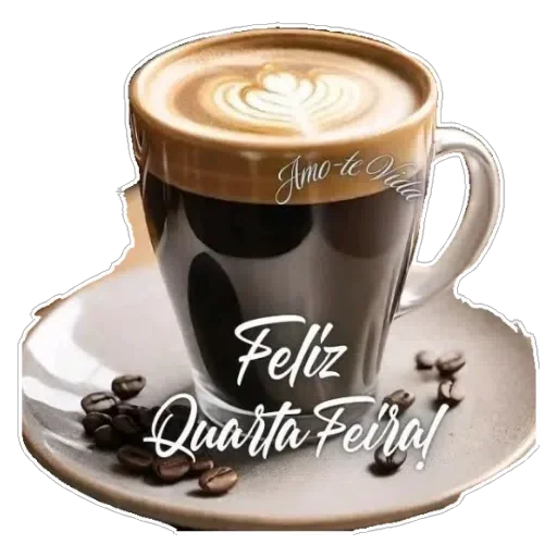 Uma xícara de café com espuma no topo e grãos de café ao redor, em um pires. Abaixo, 'Feliz Quarta Feira!' está escrito em letras brancas cursivas.