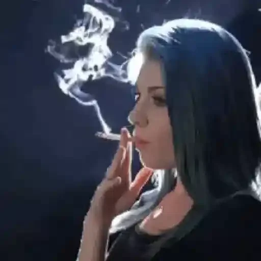 Mulher de cabelo preto fumando um cigarro com uma expressão séria, em um fundo escuro.