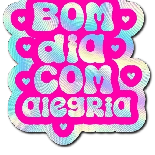 Uma figurinha colorida com o texto 'BOM dia COM alegria' em letras grandes e arredondadas, com efeito holográfico e corações ao redor.