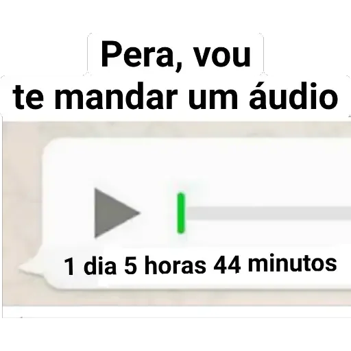 Uma figurinha de mensagem de áudio com o texto 'Pera, vou te mandar um áudio' e um player de áudio com 1 dia, 5 horas e 44 minutos de duração.