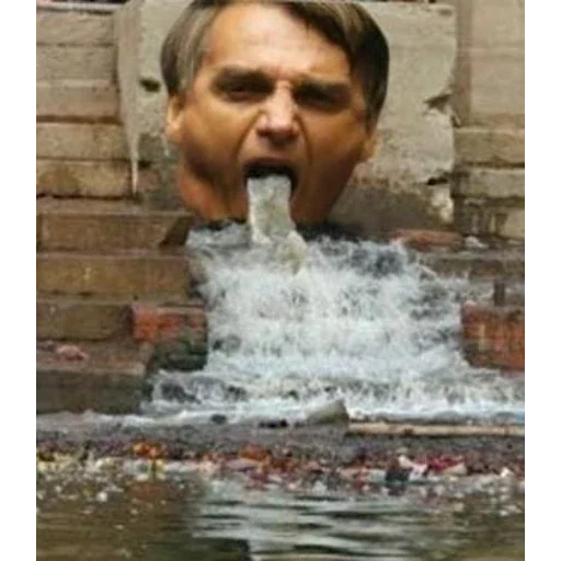 Rosto de um homem com a boca na fonte de água, como se estivesse bebendo diretamente dela. A imagem é uma montagem com o rosto de uma pessoa sobreposto a uma cena de uma fonte.