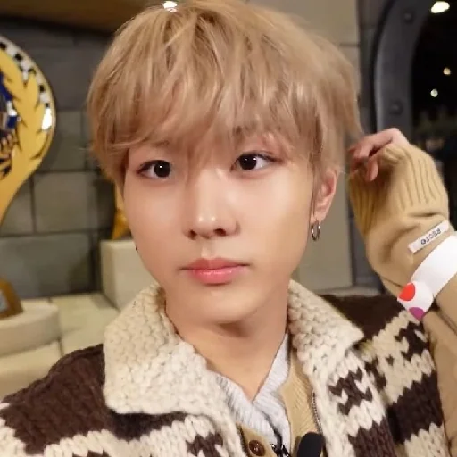 Um jovem com cabelo ruivo e uma expressão facial indiferente, usando um colar com um emoji de rosto amarelo com uma…