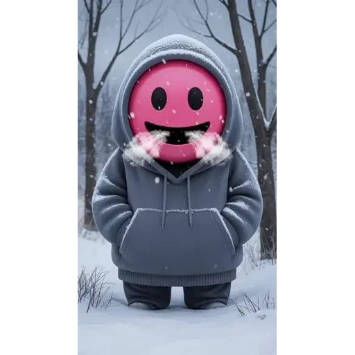 Um personagem de rosto rosa sorrindo com olhos pretos e boca aberta, vestindo um casaco cinza e capuz na neve, com árvores ao fundo.