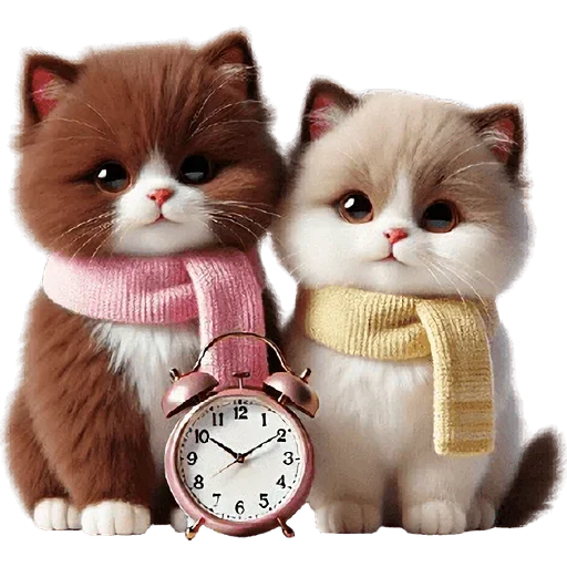 Dois gatos fofos, um castanho e um branco, usando cachecóis, um rosa e outro amarelo, sentados ao lado de um relógio de despertador rosa.