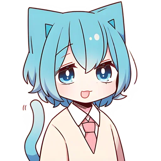 Garota de anime com cabelo azul e orelhas de gato, vestindo um suéter bege e gravata rosa, com expressão feliz.
